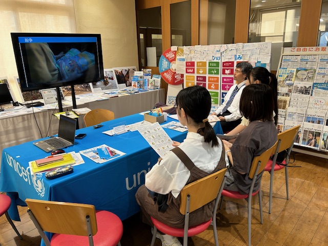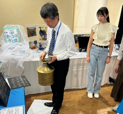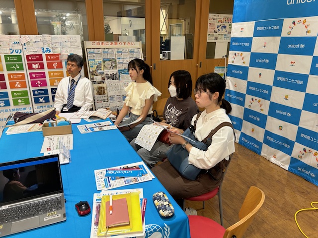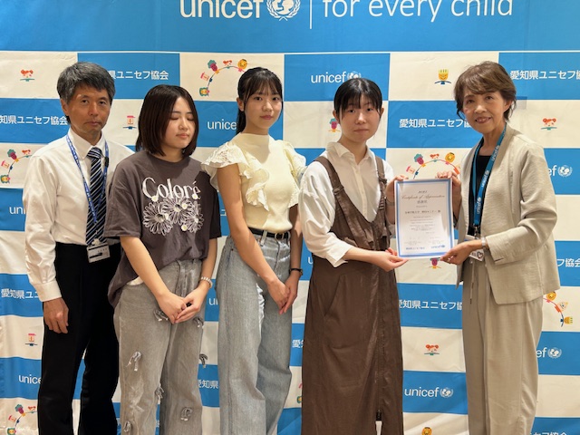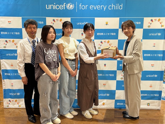 2025年9月27日(土)愛知県ユニセフ協会展示ルームにて、金城学院大学野田セミナー様からご寄付の贈呈式を行いました。金城学院大学野田セミナー様では、薬学部野田康弘教授のセミナーの学生の皆さまが、これまで学内にて使用済み切手を集める取組みをされ、この度1年かけて集まった使用済み切手をお持ちいただきました。野田教授と3名の学生の皆さまがご来訪され、贈呈式に合わせユニセフの学習会も受講いただきました。世界で深刻な人道危機に陥っている子どもたちやユニセフの活動、また子どもの権利についての説明を高い関心をもって熱心にお聞きいただき、ネパールの水がめや支援物資を手に取って見たりしながら、自分たちにできることを考え合う貴重な時間となりました。金城学院大学野田セミナーの皆さまに敬意を表しますとともに、あたたかいお気持ちに心より感謝申し上げます。ありがとうございました。