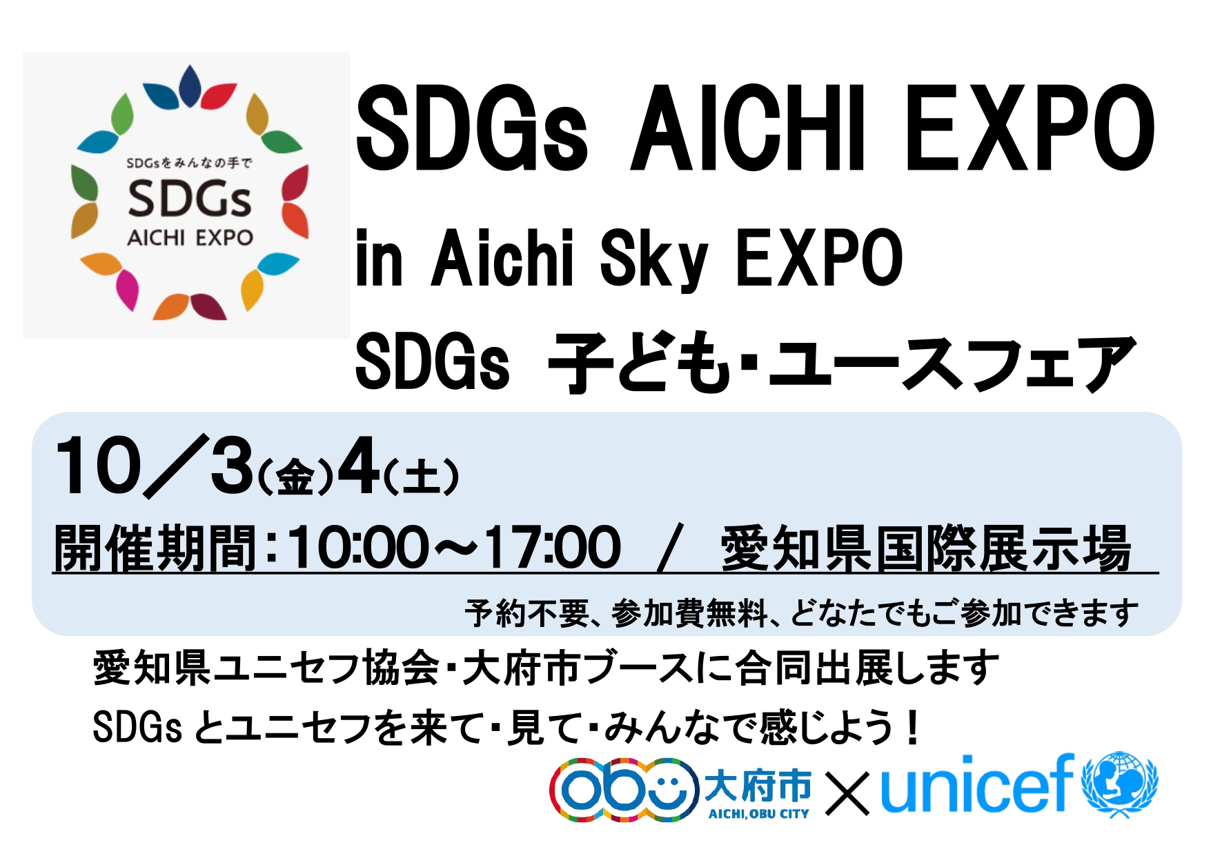 開催期間:10月3日(金)4日(土)10:00~17:00 愛知県国際展示場にて愛知県ユニセフ協会が、大府市ブースにて合同出展します。