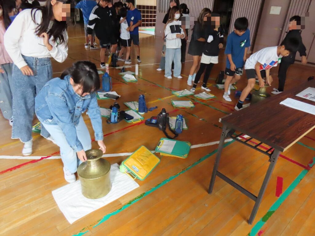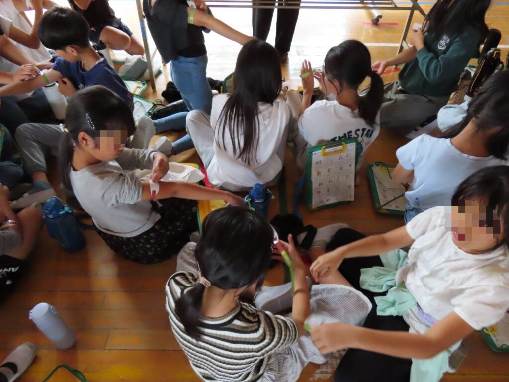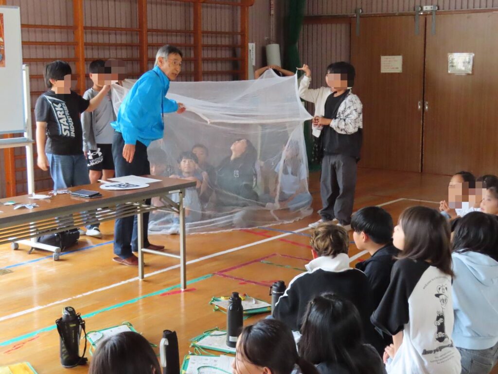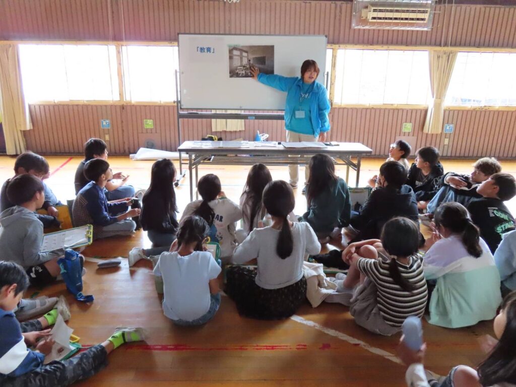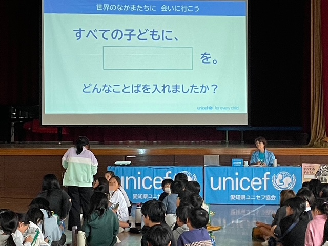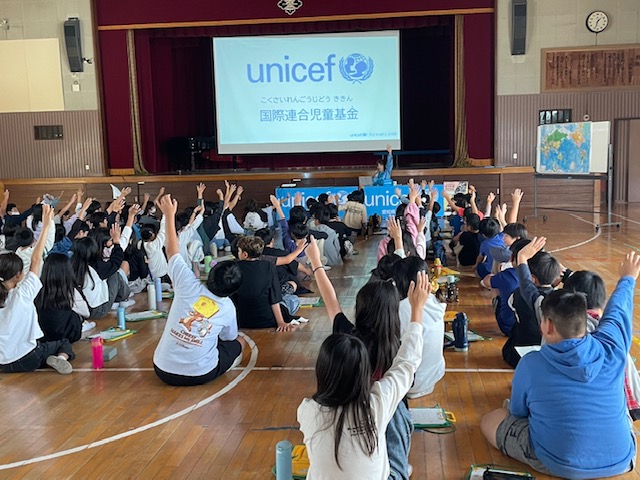 2025年10月21日(火)春日井市立不二小学校にて、5年生140名の児童の皆さんにユニセフ出前授業を行いました。体育館にて、最初に全員にユニセフ基礎講座について学んだあと、4クラスが4つのブースを回るグループワークを行いました。「栄養(上腕計測メジャー体験)」「水と衛生(水がめ体験)」「教育」「保健(蚊帳体験)」を、世界の子どもたちの状況を実感できるよう参加型のワークを行いました。皆さんがとても積極的で、問いかけにもたくさんの手が挙がり終始活気に満ちた時間となりました。最後は「すべての子どもに〇〇を」を出し合い、自分たちにできることを考え合いました。世界の子どもたちの問題を自分ごととして捉え、それぞれに寄り添った皆さんの優しい気持ちにこれからがとても楽しみになりました。貴重な時間をありがとうございました。