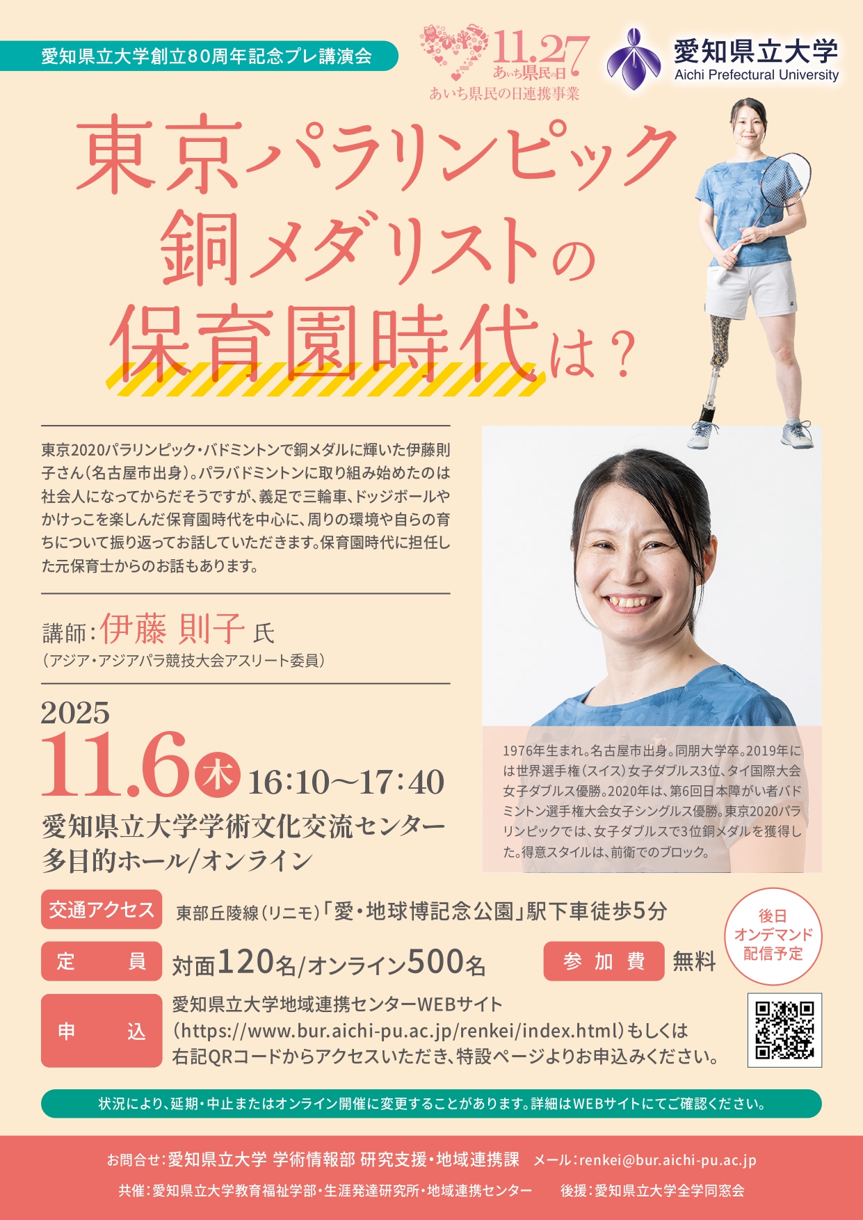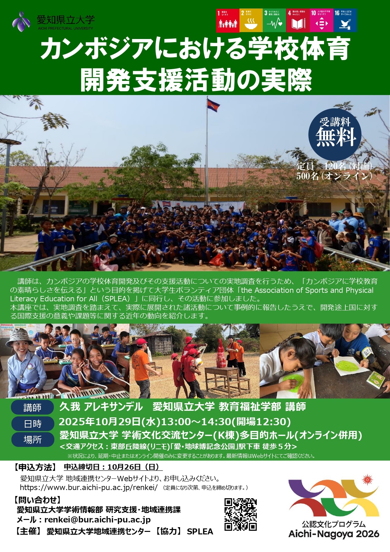 10月29日(水) 「カンボジアにおける学校体育開発支援活動の実際」、11月6日(木)「東京パラリンピック銅メダリスト伊藤則子さん講演会」をそれぞれ講師をお招きし、愛知県立大学長久手キャンパスで開催されます。お気軽にお出かけください。お申込み、お問合せはそれぞれの下記愛知県立大学受付まで。