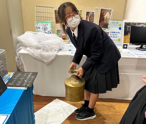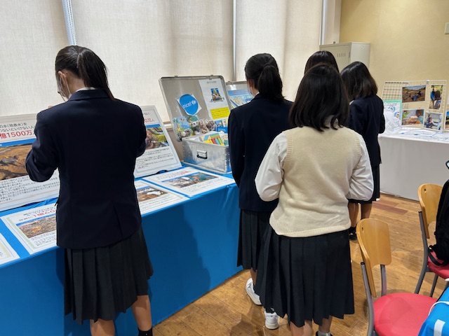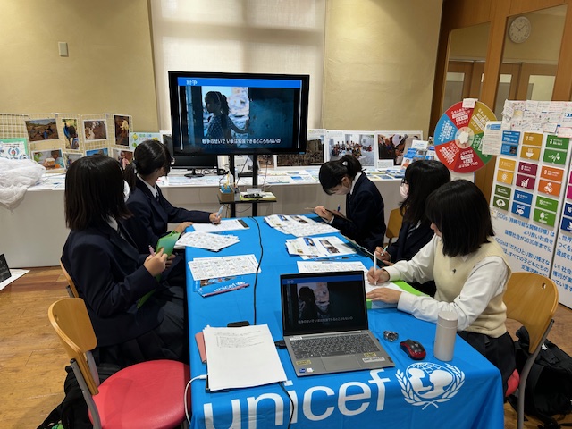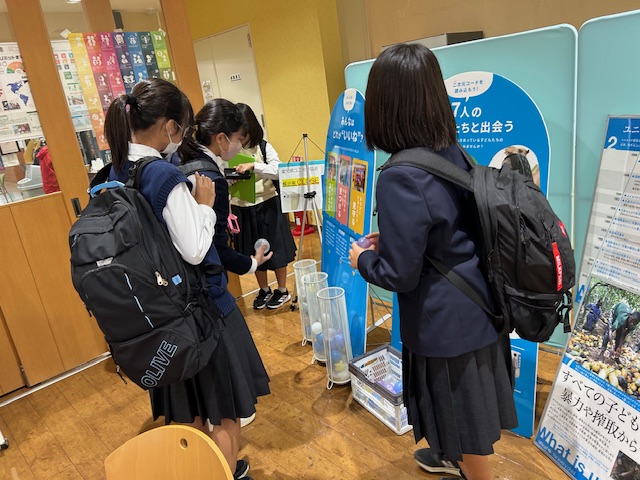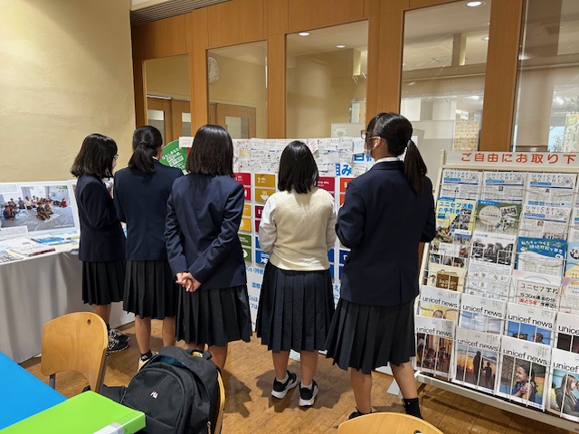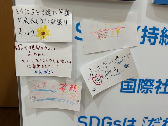2025年10月24日(金)犬山市立城東中学校1年生の皆さん5名が、校外学習で本山展示ルームでのユニセフ学習会に来訪されました。世界の子どもたちの現状や子どもの権利条約、ユニセフ活動について学習した後、展示されている支援物資や写真パネルなどを説明を聞きながら見学して回りました。事前質問による質疑応答では、ユニセフでの活動のやりがいや大切にしていること、募金の使い道の決め方、ユニセフ職員として働くための資格や経験など自らの将来を見据えた質問が相次ぎ、世界の子どもたちの状況を自分ごととして真剣に考えている様子が伺えました。高い問題意識をもった様々な視点での話合いができ、最後は皆さんにひと言メッセージを書いてSDGsボードに貼り付けていただきました。今後の活動がとても楽しみです。