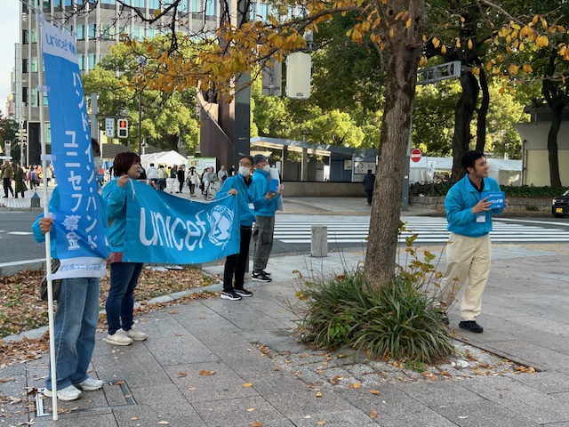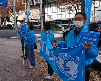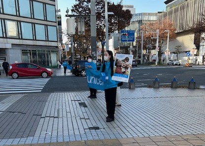 2025年11月24日(月・祝)名古屋市栄三越周辺にて、13時~15時の間、2025年度愛知県ユニセフ協会主催のユニセフハンド・イン・ハンド募金活動第1弾を行いました。秋晴れの3連休最終日とあって多くの人出でにぎわう中、ベトナムやインドネシアの留学生ボランティアさん方も一緒に募金の呼びかけをしました。「ユニセフ募金にご協力をお願いします!」の呼びかけに、お家の方から手渡された募金を嬉しそうに募金箱に入れに来てくれる子や、「ありがとう」「大変だけど頑張って!」「ユニセフなら募金するよ!」と温かいお声かけいただきながら、本当に多くの皆さまからご寄付いただきました。皆さまの笑顔と善意に心より御礼申し上げます。ありがとうございました。