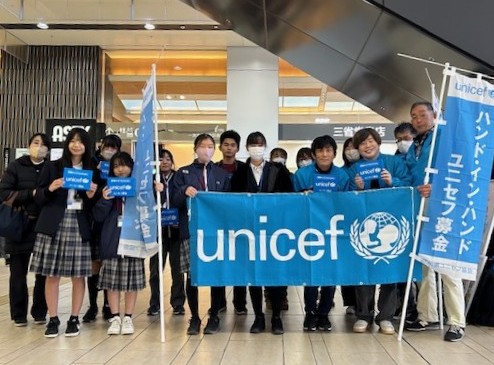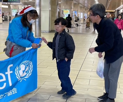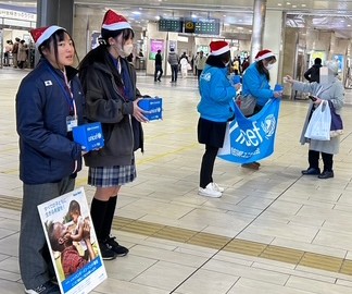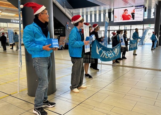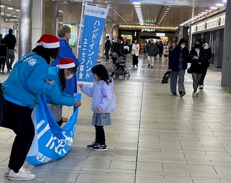 2025年12月6日(土)一宮駅前ビル1階コンコースにて、11時~13時の間、2025年度愛知県ユニセフ協会主催のユニセフハンド・イン・ハンド募金活動第2弾を行いました。一宮生活協同組合の役職員の皆さまや愛知県立津島東高校の生徒の皆さんにもご参加いただき、コンコースを行き交う多くの方々に、厳しい環境でくらす子どもたちに温かい支援と募金の呼びかけをしました。海外の方に笑顔でお立寄りいただいたり、「孫がユニセフの仕事で海外で頑張っているのよ、応援しますね」「子どもたちを守ってくれてありがとう」「寒い中ご苦労さま」など、優しいお声かけいただきながら、本当に多くの皆さまからご寄付いただきました。皆さまの笑顔と善意に心より御礼申し上げます。ありがとうございました。