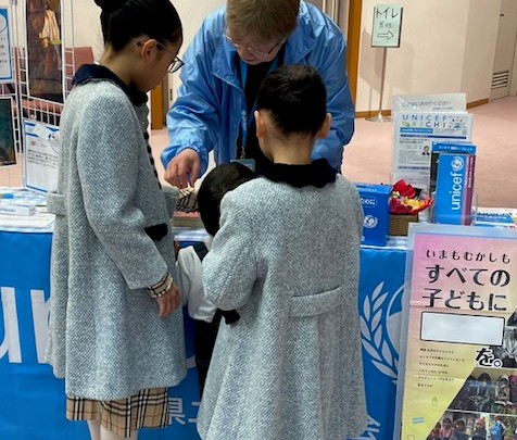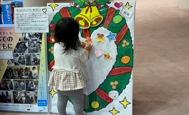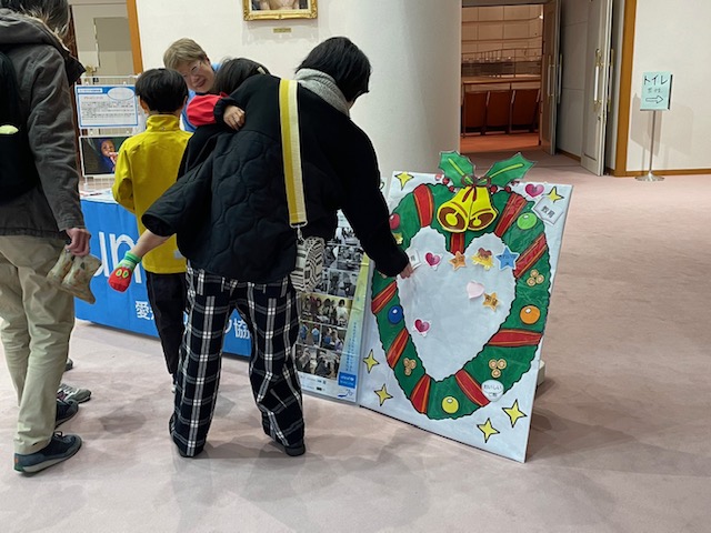2025年12月20日(土)金城学院大学アニー・ランドルフ記念講堂での金城学院幼稚園クリスマス親子礼拝にブース出展しました。「すべての子どもに〇〇を」の〇〇に当てはまる言葉を考えてもらい、「願いのリース」に貼っていただきました。「おいしいご飯」「きれいな水」「希望」「夢」など、過酷な環境で生きる子どもたちにあったらいいなと思う言葉を選びながら、『やっぱり元気!』と言いながら『元気』の文字を力強く書いてくれた子どもさんもいました。皆さまの笑顔とともに温かいご寄付もいただきました。貴重なお時間を過ごさせていただき、心より感謝申し上げます。ありがとうございました。