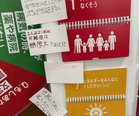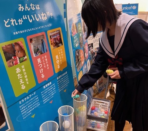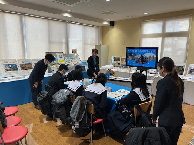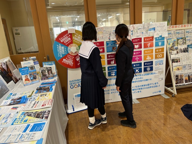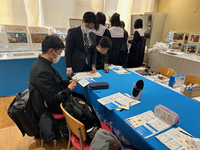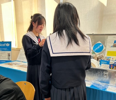 2026年1月22日(木)名古屋市立東星中学校の皆さん5名が、本山展示ルームでのユニセフ学習会に来訪されました。ユニセフ基礎講座を学んだあと、支援物資を説明を聞きながら手に取って見学いただきました。終始真剣な眼差しで聞いてくださり、都度つどたくさんの質問が出され活発な意見交換ができました。幅広い問題意識をもった様々な視点での話合いができ、問題の本質に迫り、自らの行動に繋げようとする意気込みに頼もしさを感じました。最後に皆さんの想いをメッセージに書いてボードに貼り付けてくださいました。心温まる貴重な時間をありがとうございました。